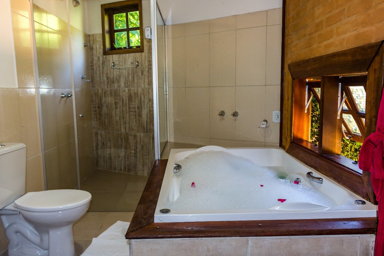 Suíte espaçosa e temática com hidromassagem, Wifi, lareira, ventilador de teto, ducha a gás, frigobar e varanda com rede.