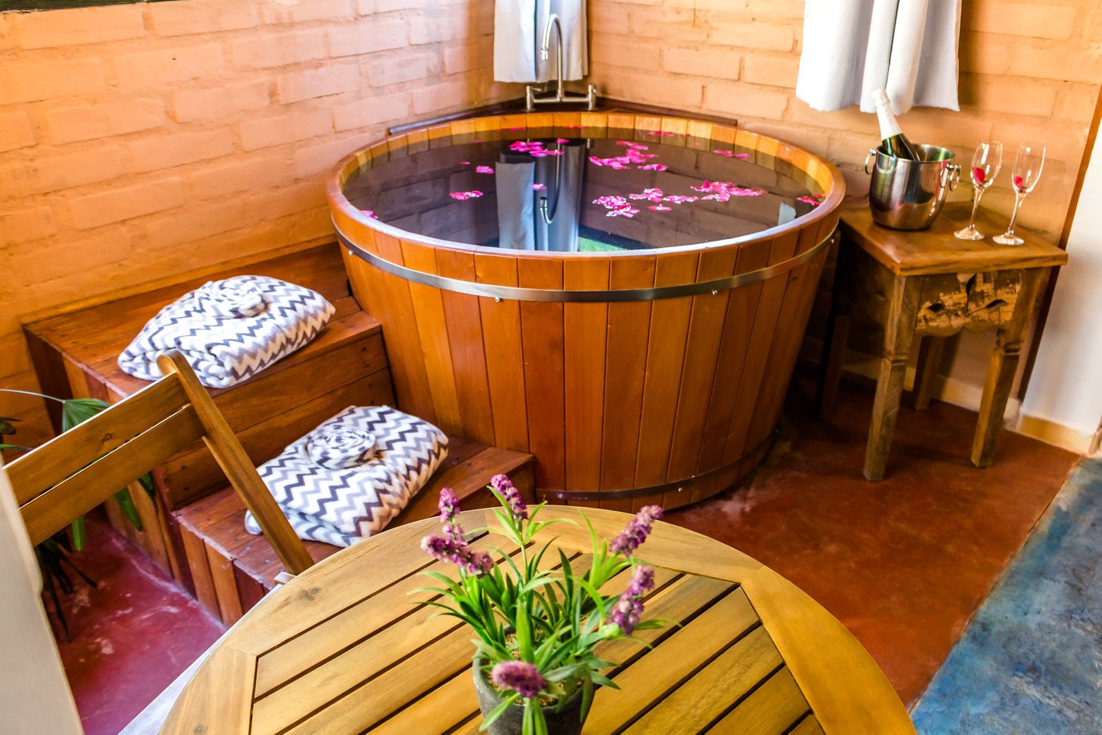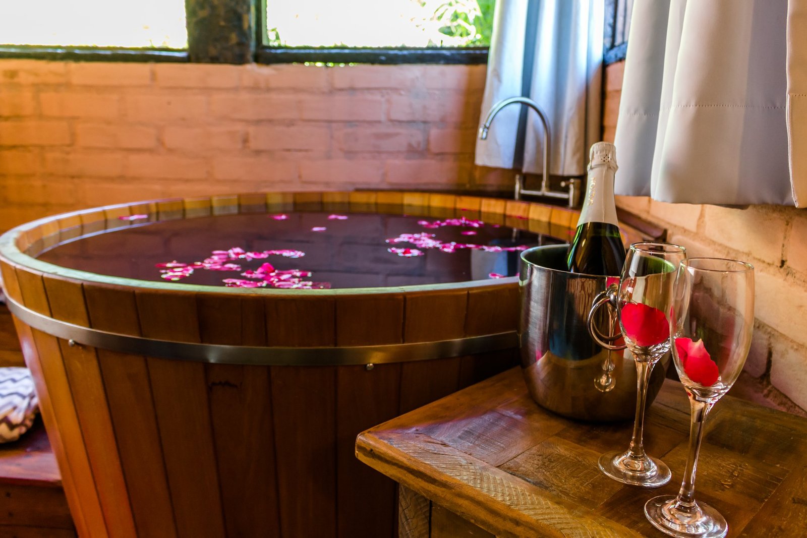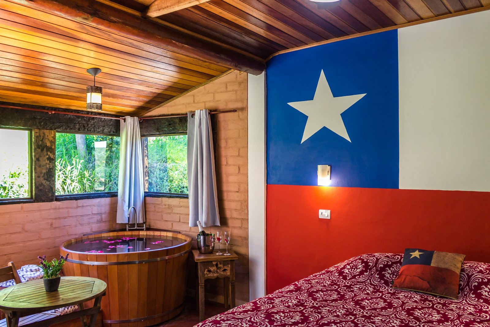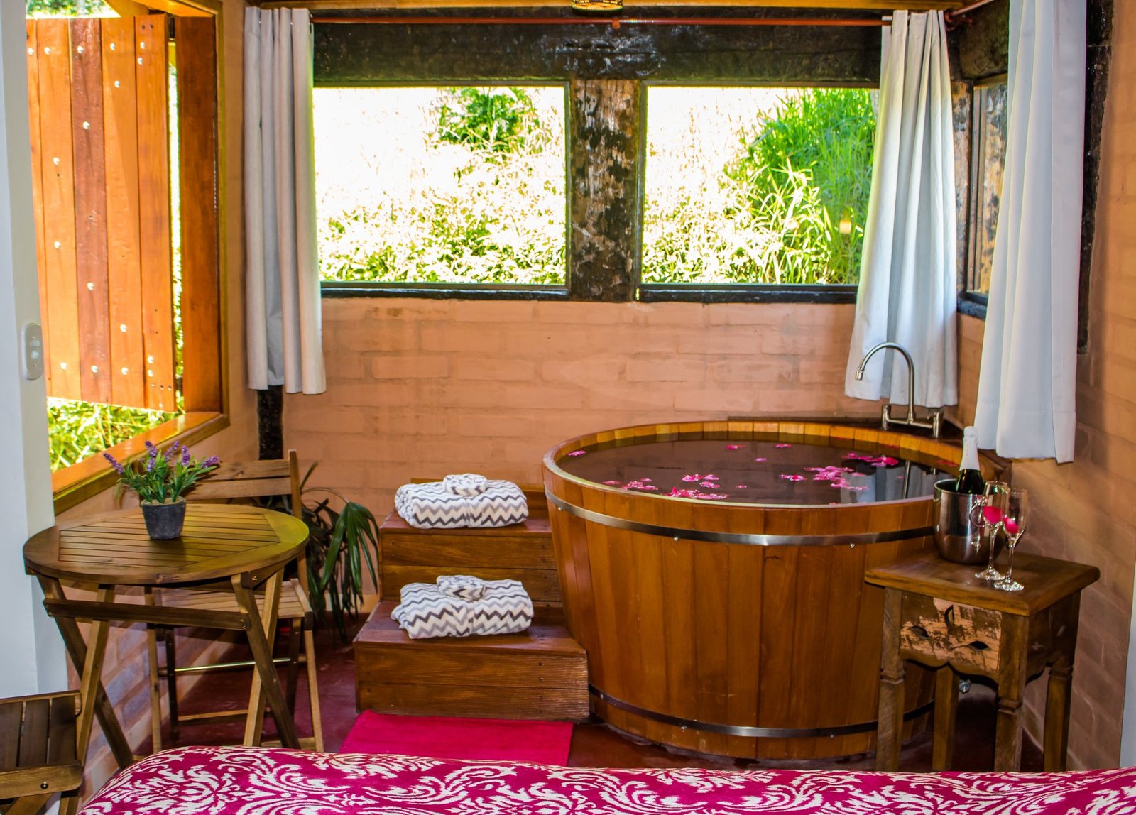 Suite charmosa e temática com lareira, Wifi, ofurô, ventilador de teto,ducha a gás, frigobar e varanda.