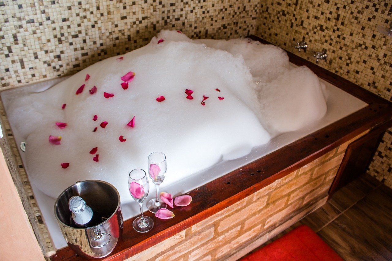 Chalé extremamente espaçoso e confortável de 65 m², com lareira, Wifi, cama Queen-size, sala com TV e sofá-cama de casal, espaço-cozinha com frigobar, hidromassagem, varanda com rede e namoradeira, ducha à gás. Para casal ou uma família até 4 pessoas.